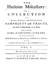 The Harleian Miscellany is a collection of material from the library of the Earl of Oxford and Earl Mortimer collated and edited by Samuel Johnson and William Oldys between 1744 and 1753 on behalf of the publisher Thomas Osborne. Its subtitle was A Collection of Scarce, Curious, And Entertaining Pamphlets And Tracts, as well In Manuscript As In Print, Found In The Late Earl Of Oxford's Library, Interspersed With Historical, Political, And Critical Notes.