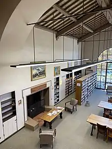 The room includes a large window with a view of the garden and seating for 18 is available around three tables. There is also a table and chairs in front of a fireplace. Above the fireplace is a sign that says: "Barnet Segal Reading Room."[10]