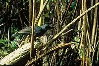 The Hawaiian crow or ʻalalā (Corvus hawaiiensis) is a species of bird in the crow family, Corvidae, that is currently extinct in the wild, though reintroduction programs are underway. It is about the size of the carrion crow at 48–50 cm (19–20 in) in length,[3] but with more rounded wings and a much thicker bill. It has soft, brownish-black plumage and long, bristly throat feathers; the feet, legs and bill are black. Today, the Hawaiian crow is considered the most endangered of the family Corvidae.[4] They are recorded to have lived up to 18 years in the wild, and 28 years in captivity. Some Native Hawaiians consider the Hawaiian crow an ʻaumakua (family god).[5]