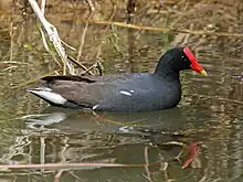 The gallinule inhabits mainly freshwater lowland wetlands, usually below 125 m elevation, such as streams, springs or seeps, natural ponds, marshes, wet meadows, lotus and taro fields, reservoirs, sediment basins, sewage ponds, and drainage ditches. It prefers dense emergent vegetation near open water, often with floating mats of vegetation, with water depths of less than a metre.[5] To a lesser extent it will visit brackish or marine wetlands such as lagoons and shrimp aquaculture ponds.[4] Although the birds are non-migratory, banding studies show that some dispersal occurs in spring between wetlands (and possibly between islands), in response to changes in water levels.[8]