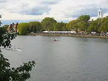 The Head of the Charles Regatta, also known as HOCR, is a rowing head race held on the penultimate complete weekend of October (i.e., on the Friday that falls between the 16th and the 22nd of the month, and on the Saturday and Sunday immediately afterwards) each year on the Charles River, which separates Boston and Cambridge, Massachusetts United States. It is the largest 3-day regatta in the world, with 11,000 athletes rowing in over 1,900 boats in 61 events. According to the Greater Boston Convention & Visitors Bureau, the three-day event brings 225,000 people to the Greater Boston area and $72 million to the local economy.[2]