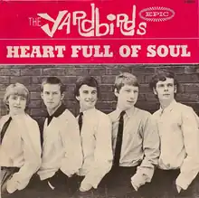 "Heart Full of Soul" saw its first album release on the Yardbirds' second American LP record, Having a Rave Up (1965).[5] In Canada, Capitol Records included the song on both their first album, titled Heart Full of Soul (1965, also known as Presenting the Yardbirds), and second album, Having a Rave Up (1965).[10] It was also chosen for the popular American compilation The Yardbirds Greatest Hits (1967).[10] In the UK, the earliest album appearance was on Remember ... The Yardbirds, a collection of pre-Yardbirds (also known as Roger the Engineer) material released in 1971 after the group disbanded.[10] Numerous later compilations include it, such as Ultimate! (2001), the comprehensive career retrospective released by Rhino Records.[8][11]