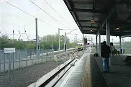 With the project delayed, a decision was made to open a temporary surface-level station at the edge of the airport whilst construction continued. The line to the new station followed the route of a long-disused canal known as "Broad's Dock".[4] Heathrow Junction station was situated in Stockley Park, slightly to the north of the airport. Class 332 trains (branded as "Heathrow Fast Train") carried passengers from Paddington to Heathrow Junction (a journey of 12 minutes), and a fleet of shuttle buses carried the passengers the remaining distance to the airport.[5]