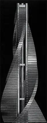 The Helicoidal Skyscraper was a planned but never materialized, 565 m (1,854 ft) high business center that was to have been built on the tip of Manhattan, New York City. It was a stillborn project developed between 1968 and 1974 by Italian architect Manfredi Nicoletti. It combined its aerodynamic shape with the technology of wired bridges, for the purpose of minimizing both the loads and structural bulk.[1]