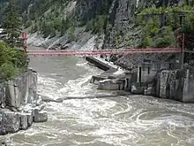 The name Hells Gate was derived from the journal of explorer Simon Fraser, who in 1808 described this narrow passage as "a place where no human should venture, for surely these are the gates of Hell."[1] Long before the arrival of Simon Fraser, and as early as the end of the last ice age, Hells Gate was a First Nations congregation ground for settlement and salmon fishing.[2] Archaeological evidence from old occupation sites and isotope analysis of human skeletal remains suggest that settlement and migration patterns for indigenous peoples in the Canyon correlated with the seasonal migration patterns of Pacific salmon.[3] During the last deglaciation 4000–6000 years ago, long tongues of ice formed wedges and dams in the river's basin above the canyon, resulting in the formation of large reservoirs and new lakes—creating optimal spawning grounds for salmon.[4] During this inter-glacial period, salmon began to populate the Fraser River and used Hells Gate passage as their route to upstream spawning grounds.[3] Constricted by two steep subvertical granodiorite walls, the incredibly narrow passage and high water velocity made this part of the upstream journey extraordinarily difficult for salmon, and they would hover along the shores of the river or rest in its back-eddies. As a result, Hells Gate’s geology provided the Indigenous fishers with superb opportunities to readily catch salmon congregated at the river’s edge attempting to elude the strong currents and rough waters. Hells Gate became one of the most popular fishing stations along the Fraser River— pre- and post-colonial contact— where large numbers of aboriginal locals, and eventually European settlers, congregated during the summer months to fish for migrating salmon. Standing on adjacent rocks or on specially constructed wooden platforms extending from surrounding cliffs, fishermen would use long dip nets to snatch the salmon.[3] As salmon fishing at Hells Gate was so prolific that, as Matthew Evenden asserts, the aboriginal culture along the Fraser River was built on a "salmon economy."[3] After Simon Fraser charted the river in the early nineteenth century, it became (and Hells Gate with it) an established corridor between the Pacific Ocean and the interior of what was to become British Columbia. Yet, as Fraser first noted, safe water transportation through the 115 foot wide opening at Hells Gate has proven virtually impossible.[5]