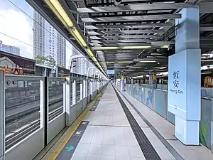 Heng On (Chinese: 恆安; Cantonese Yale: Hàng'ōn) is a station on the Tuen Ma line of Hong Kong MTR, named after the nearby Heng On Estate. It also serves other residential areas like Kam Fung Court, Kam On Court, Baycrest, Vista Paradiso, and Yiu On Estate. It also serves over 10 schools (including Renaissance College) and two sports centres – Ma On Shan Sports Ground and Heng On Sports Centre.
