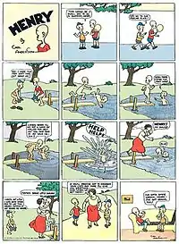 The daily strip went into reruns in 1995, and the Sunday strip in 2005.[1] After 84 years of syndication, Henry was discontinued on October 28, 2018.[2]