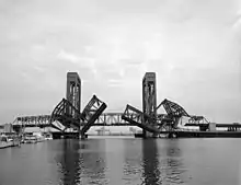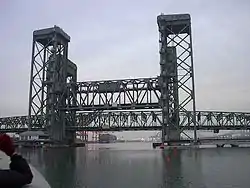 The original 1924 bascule bridge was dismantled and replaced in 1996 by a vertical-lift bridge.[1]