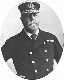 On 4 August 1890 Stephenson was promoted rear admiral,[19] serving as Commander-in-Chief of the Pacific Station from 4 May 1893 to 19 June 1896.[20] He was promoted vice admiral on 10 October 1896,[21] serving from 7 June 1897 to 20 December 1898 as Commander-in-Chief of the Channel Squadron. He was appointed a Knight Commander of the Order of the Bath (KCB) on 22 June 1897 during the celebrations of Queen Victoria's Diamond Jubilee,[22] he flew his flag from HMS Majestic during the Spithead Naval Review marking the Jubilee on 26 June 1897.[23] On the accession of Edward the VII, he became an Extra Naval Equerry,[24] he was promoted admiral on 7 December 1901,[25] and from 28 March 1902 to 1904 he was the First and Principal Naval Aide-de-Camp to King Edward VII.[26][27] He retired on 16 September 1904 with the rank of admiral.[28]