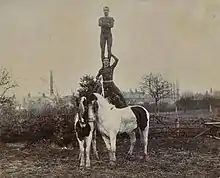 Although I always liked horses, I didn't merely want to drive other people. I wanted to drive 'em myself. So I managed to get in with a small travelling circus, and before my bones were set they made an acrobat of me. When I was about 12 or 14 I joined Sanger's Circus, and from them I went to Hughes' Circus. It was with Hughes' Circus that I went out to China. There was a juggler among us, but the Chinese didn't think much of him. There wasn't anything he could teach them, you see. But it was different with me. They couldn't do what I could do ... Well, I was an all round gymnast, I reckon, and I could stand on my head on a pole, do somersaults on a horse, and do somersaults blindfolded, too.[5]