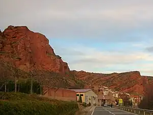 View of Herce and the striking red rock cliffs towering above the town