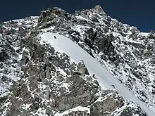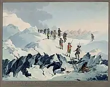 In the Alps a high mountain tour is known in the German-speaking areas as a Hochtour where, above a height of about 3,000 metres (High Alps), many mountains are at least partly glaciated. Important historic milestones in the development of high mountain touring in the Alps were the first ascents of the Ankogel (3,262 m) in 1762, Mont Blanc (4,810 m) in 1786, the Großglockner (3,798 m) in 1800 and the Ortler (3,905 m) in 1804 as well as the conquest of many high western Alpine summits during the golden age of Alpinism around the middle of the 19th century.[1] In other parts of the world the term may be misleading. For example, in many non-Alpine areas, such as the polar regions, much lower mountains are glaciated. On the other hand, the summits of much higher peaks in the tropics are not always in the nival zone. As a result, their ascent cannot automatically be described as a high mountain tour using the Alpine definition, even if they share some of the features of Alpinism, such as requiring a certain acclimatization. Mountaineering expeditions in which elevation plays a particularly important role, especially those from about 7,000 m are no longer referred to as high mountain tours, but tend to be described by the term high altitude mountaineering.[2]