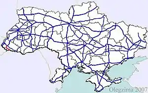 Highway M23 is one of the shortest Ukrainian international highway (M-highway) which connects Berehove with Khust and runs in the southern portion of the region next to the Hungarian and Romanian borders.[1] From Berehove to the little settlement of Vylok, the M23 is part of European route E58 and European route E81 which drift of towards the Romanian border at the border checkpoint Okli on a regional route.[2]