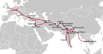 Journeys would typically start from cities in western Europe, often London, Copenhagen, West Berlin, Paris, Amsterdam, or Milan. Many from the United States took Icelandic Airlines to Luxembourg. Most journeys passed through Istanbul, where routes divided. The usual northern route passed through Tehran, Herat, Kandahar, Kabul, Peshawar and Lahore on to India, Nepal and Southeast Asia.[3] An alternative route was from Turkey via Syria, Jordan, and Iraq to Iran and Pakistan. All travellers had to cross through the Khyber Pass, traversing Peshawar and Lahore in Pakistan[3] and over the Pakistan-India border at Ganda Singh Wala (or later at Wagah).