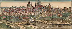 In 1327 most of the city was destroyed by a fire but was rebuilt, extended and protected with a new fortification some years later. Philosophers like Michael of Cesena, Marsilius of Padua and William of Ockham supported Louis IV in his fight with the papacy and were protected at the emperor's court. After the citizenry revolted several times against the dukes, a new castle was built close to the fortification, starting in 1385. An uprising of the guilds in 1397 was suppressed in 1403.