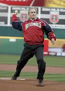 - On April 14, 2005, the Washington Nationals won their first regular season home game at RFK Stadium in Washington, D.C, by a score of 5–3 against the Arizona Diamondbacks. President George W. Bush kept up a tradition of sitting U.S. Presidents by throwing out the ceremonial first pitch on opening day in Washington, exactly 95 years after William Howard Taft started the tradition at Griffith Stadium. There were 45,596 fans in attendance, including former Senators players and Baseball Commissioner Bud Selig. Liván Hernández threw eight shutout innings, and Vinny Castilla was denied the chance to hit for the cycle when Diamondback reliever Lance Cormier hit him with a pitch in the bottom of the eighth; Castilla needed only a single to complete the cycle. Chad Cordero recorded the save for Washington.