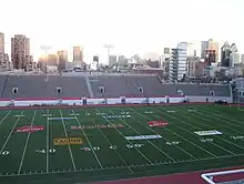 Principal photography began on 15 September 2016 and was expected to last 42 days, employing thousands of extras.[7] All 300 extras playing Indigenous characters were portrayed by Indigenous people.[6] Filming continued in Montreal in October 2016 to February 2017.[14][5] The initial football scenes were shot at Percival Molson Memorial Stadium.[14] Rainstorms delayed some production.[14]