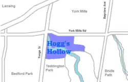Hoggs Hollow is named after the Hogg family. James Hogg (1797–1839), a Scotsman, settled in the area in 1824.[1] He operated a whisky distillery and a grist mill, and he was viewed as the most successful of all the millers in the valley. The name of the neighbourhood is usually written without an apostrophe as Hoggs Hollow, but it sometimes appears with an apostrophe as Hogg's Hollow.