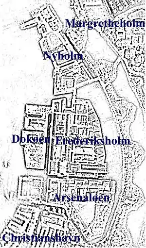 While development on Nyholm was continuing, a little island by the name of Motzmanns Plads, just north of Christianshavn, was bought. Later it was renamed to Christiansholm. A new island was created, with landfill, just east of Christianholm, where a large arsenal was built and finished in 1770. Later, this island was named Arsenaløen and was expanded to the east.