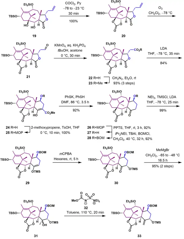 As shown in Scheme 3, diol 19 was protected with phosgene as a carbonate ester (20). The terminal alkene group of 20 was next converted to a methyl ester using ozonolysis followed by oxidation with potassium permanganate and esterification with diazomethane. Ring expansion to give the cyclohexane C ring 24 was achieved using a Dieckman condensation of lactone 23 with lithium diisopropylamide as a base at -78 °C. Decarboxylation of 24 required protection of the hydroxyl group as the 2-methoxy-2-propyl (MOP) ether (25). With the protecting group in place, decarboxylation was effected with potassium thiophenolate in dimethylformamide to give protected hydroxy ketone 26. In the next two steps the MOP protecting group was removed under acidic conditions, and alcohol 27 was reprotected as the more robust benzyloxymethyl ether 28. The ketone was converted to the trimethylsilyl enol ether 29, which was subsequently oxidized in a Rubottom oxidation using m-chloroperbezoic acid to give the trimethylsilyl protected acyloin 30. At this stage the final missing carbon atom in the Taxol ring framework was introduced in a Grignard reaction of ketone 30 using a 10-fold excess of methylmagnesium bromide to give tertiary alcohol 31. Treatment of this tertiary alcohol with the Burgess reagent (32) gave exocyclic alkene 33.
