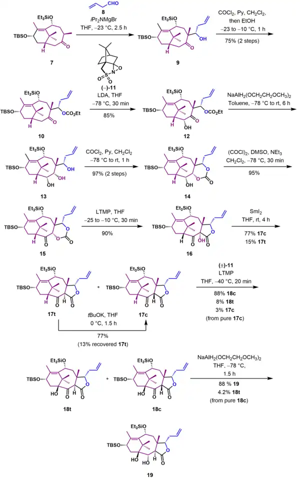 The Holton Taxol total synthesis is a good example of a linear synthesis. The synthesis starts from patchoulene oxide, a commercially available natural compound .[3] This epoxide can be obtained in two steps from the terpene patchoulol and also from borneol.[4][5] The reaction sequence is also enantioselective, synthesizing (+)-Taxol from (−)-patchoulene oxide or (−)-Taxol from (−)-borneol with a reported specific rotation of +- 47° (c=0.19 / MeOH). The Holton sequence to Taxol is relatively short compared to that of the other groups (46 linear steps from patchoulene oxide). One of the reasons is that patchoulene oxide already contains 15 of the 20 carbon atoms required for the Taxol ABCD ring framework.