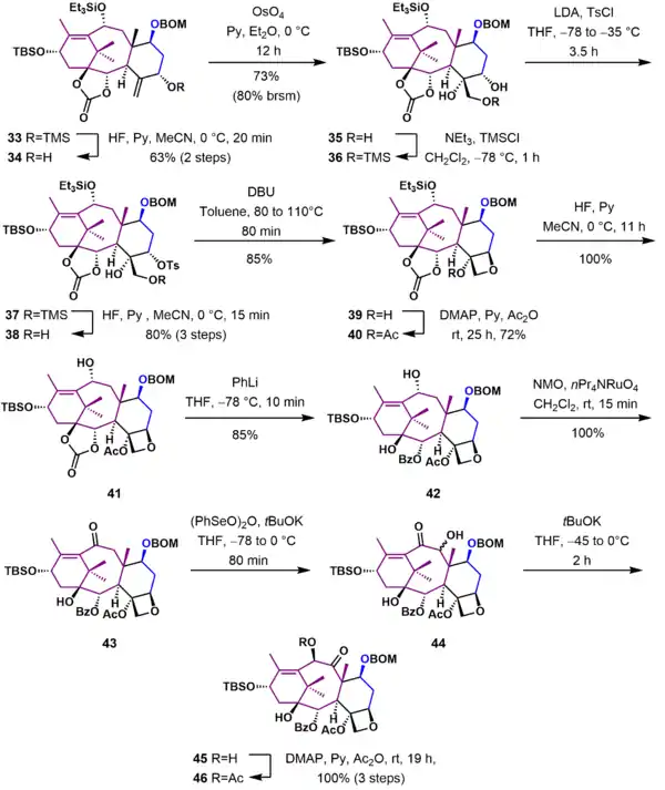 In this section of the Holton Taxol synthesis (Scheme 4), the oxetane D ring was completed and ring B was functionalized with the correct substituents. Allylic alcohol 34, obtained from deprotection of silyl enol ether 33 with hydrofluoric acid, was oxidized with osmium tetroxide in pyridine to give triol 35. After protection of the primary hydroxyl group, the secondary hydroxyl group in 36 was converted to a good leaving group using p-toluenesulfonyl chloride. Subsequent deprotection of the trimethylsilyl ether 37 gave tosylate 38, which underwent cyclization to give oxetane 39 by nucleophilic displacement of the tosylate that occurred with inversion of configuration. The remaining unprotected tertiary alcohol was acylated, and the triethylsilyl group was removed to give allylic alcohol 41. The carbonate ester was cleaved by reaction with phenyllithium in tetrahydrofuran at -78 °C to give alcohol 42. The unprotected secondary alcohol was oxidized to ketone 43 using tetrapropylammonium perruthenate (TPAP) and N-methylmorpholine N-oxide (NMO). This ketone was deprotonated with potassium tert-butoxide in tetrahydrofuran at low temperature and further oxidized by reaction with benzeneseleninic anhydride to give α-hydroxyketone 44. Further treatment of 44 with potassium tert-butoxide furnished α-hydroxyketone 45 through a Lobry-de Bruyn-van Ekenstein Rearrangement. Substrate 45 was subsequently acylated to give α-acetoxyketone 46.