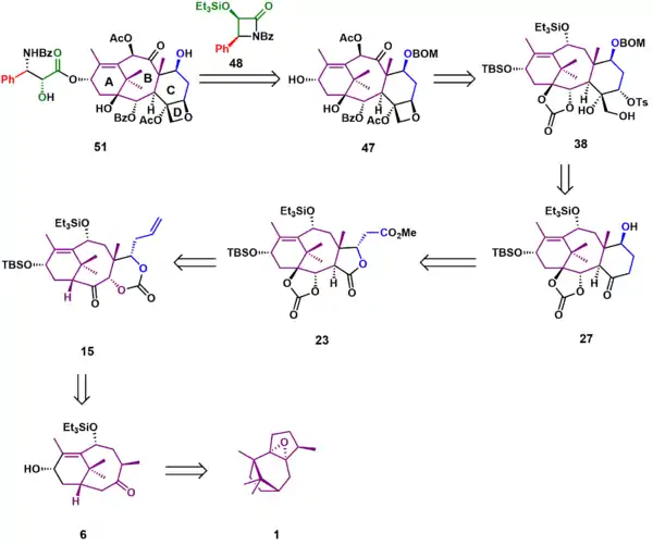 It was envisaged that Taxol (51) could be accessed through tail addition of the Ojima lactam 48 to alcohol 47. Of the four rings of Taxol, the D ring was formed last, the result of a simple intramolecular SN2 reaction of hydroxytosylate 38, which could be synthesized from hydroxyketone 27. Formation of the six-membered C ring took place through a Dieckmann condensation of lactone 23, which could be obtained through a Chan rearrangement of carbonate ester 15. Substrate 15 could be derived from ketone 6, which, after several oxidations and rearrangements, could be furnished from commercially available patchoulene oxide 1.