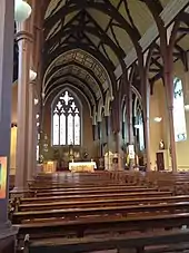 Extensive renovations were carried out in the 1980s at the instigation of church guardian Father Eustace McSweeney, who wished to bring the church's interior in line with the liturgy of the Second Vatican Council. Structural flaws and problems such as dry rot evidently riddled the building, to the extent that some suggested demolishing and rebuilding the church from scratch.[27][34] At a cost of £500,000, the church was entirely renovated within a year in 1982. This involved, controversially, replacing the casings around the cast-iron columns with more slender wooden casings and removing the original pulpit, high altar and confessionals.[27][35] The interior porch was extended in 2013 to encompass the area beneath the balcony.[36]