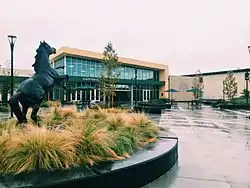 Homestead High School is bordered by Homestead Road to the north and Interstate 280 to the south. Beginning in the summer of 2009, solar panels and shade structures were added over both parking lots, and the fields were reorganized so that a new stadium could be constructed. The other half of campus, facing Homestead Road, consists of several school buildings. The majority of the buildings have an inner corridor with outdoor corridors connecting the buildings. Green-colored hoofmarks decorate Homestead's sidewalks and walkways, which are from the school's team name and one of the school's colors. The front walls of the school are decorated with murals of a similar theme, including a large mural of a mustang.[12]