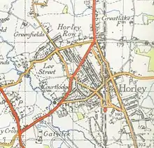 The first written record of Horley is a charter from the late-12th century, in which it appears as Horle. In 1203, it is recorded as Horleg and in 1219 as Horlei.[3] In the 13th century, it appears as Horleia,[4] Hornle and Hornly, and in 1428 as Horneele.[3] The second half of the name, –ley, derives from Old English: leah meaning a woodland or clearing. The first part may indicate ownership by a person called "Horne" or that the land was horn-shaped.[3][4]