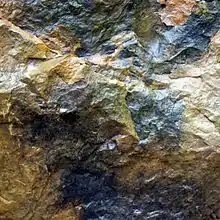 Horsham Stone is a type of calcareous, flaggy sandstone containing millions of minute sand grains and occurring naturally in the Weald Clay of south-east England.[1] It is also high in mica and quartz. The rock extends in an arc-like formation for several kilometres around the town of Horsham from which it takes its name, and lies just below the Weald Clay surface in bands 10 to 13 centimetres (3.9 to 5.1 in) thick.[1] Horsham Stone is significant for its ripple-marked appearance, formed by the action of the sea similar to the ripples on the sandbanks and beaches of Sussex.[2]