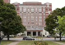 The hotel, like others opened by Canadian National Hotels, was designed by Archibald and Schofield, comprising the Canadian architects John Smith Archibald and John Schofield. It was designed as a complex with the Halifax railway station and the Cornwallis Park across the street. The central axis of the park is aligned with the front entrance of the Nova Scotian.[3] The hotel had 130 rooms and five suites over eight storeys. The Atlantic Ballroom could accommodate up to 275 dinner guests.[4] In 1933 the ballroom held host to the largest fraternity gathering[5] in the city for the chartering of local fraternity Delta Tau to a Sigma Chi Fraternity. chapter Gamma Rho. A new wing was built to the north in 1959, adding 161 more rooms including nine more suites.[4] In 1966, the name was changed to the Hotel Nova Scotian.