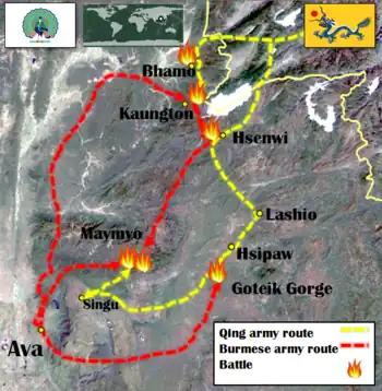 The conflict with the Chinese had its beginnings in the 1758–59 campaign by the Burmese to reassert Burmese authority in the Burmese-Chinese borderlands whose chiefs historically had paid tribute to both sides but had become solely Chinese tributaries since the mid-1730s. The Chinese at first decided to use local Tai-Shan militias to reassert their control but by 1765, the Qianlong Emperor decided to send in the regular Chinese troops. The Chinese began their invasion in December 1765, just as the Burmese armies were marching towards Ayutthaya. Hsinbyushin refused to recall the main Burmese armies in Siam. At first, the strategy seemed to work well. The remaining Burmese armies handily defeated the first two Chinese invasions at the border.[15]