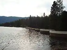 To create this reservoir, John S. Eastwood was hired in 1908 to construct a dam at Long Meadow.[2] Eastwood proposed constructing the world's first reinforced concrete multiple arch dam. Although unprecedented, at a cost of approximately $46,000, the dam's design was a less expensive alternative to a conventional rock fill dam that would have cost about twice as much to construct. The dam was completed in only 114 days, by the end of 1909, along with a mill immediately adjacent to the dam.[3] Logs were dumped into the reservoir by rail and floated to the dam where they were drawn up into the mill, cut and then dried in kilns next to the mill on the west bank of Tenmile Creek. From this location, lumber was floated to Sanger, California, in a flume filled with water from the reservoir. The flume was the longest ever created, eventually stretching 73 miles (117 km) from Hume Lake to Sanger.[4] Designed and built by James Carroll Goss, the flume was used by both the lumber company and tourists. Thrill seeking tourists would occasionally ride in the flume down from the Sierras in special boats designed with an open prow so that water would help keep the boats from flying off into the air. The flume was also reputedly utilized in 1893 by the bandit Chris Evans, of the Evans-Sontag Gang of Train Robbers, who hid along the flume to evade capture after escaping from the Fresno County Jail with his accomplice Ed Morrell.[5]