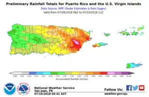 Mass power outages were reported on the U.S. Virgin Island of St. Croix, and officials ordered closures of schools and government offices.[41][1] Due to the effects of previous Hurricanes Irma and Maria, over 60,000 people in Puerto Rico had blue tarps provided by FEMA as temporary roofs. However, tarps were easily blown off due to strong wind gusts from Beryl's remnants.[46] Lieutenant Governor Luis Rivera Marín reported that some rivers began flooding by noon local time on July 9.[47] Rainfall was the heaviest in Eastern Puerto Rico, where over 8 inches of rain fell.[49] The enhanced rainfall also triggered flash flooding that closed several roadways and downed several trees. A landslide was reported in the town of Naranjito, although there were no reports of fatalities or injuries.[50] A tree was blown down onto a road in Guayama.[51] Floodwaters entered a residence in Las Piedras, trapping three people.[52] The Fajardo River overflowed its banks, causing a road to be impassable.[53] Vehicles were trapped on Puerto Rico Highway 909 near Humacao after the road was inundated by floodwaters.[54] By the time the storm passed, approximately 47,000 Puerto Ricans lost power on the island as a result of gusty winds from squalls.[1][55]