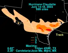 ![]() Claudette shortly after landfall in Texas on July 15 | |