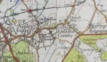 In the 1870s Crawley-Husborne was described as "a parish in Woburn district, Beds; on the Bedford and Bletchley railway, ¾ mile SW of Ridgmount r. station, and 1¾ NNE of Woburn."[4]