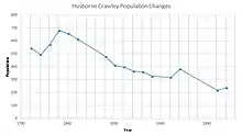 Husborne Crawley has a population of 237 according to the 2011 census.[13] Increasing from a population of 217 according to the 2001 census.[12] From the graph, the total population has changed large amounts for a small parish, decreasing more recently possibly due to people moving closer to larger local areas such as Milton Keynes, Leighton-Linslade or Dunstable as they are the larger settlements in the area.[14] There are some gaps in the information as none was available, however clearly there has been a general decrease until very recently where the population has increased again. The changes have not been large enough and are more gradual to be from an event that might alter populations rapidly.[15]