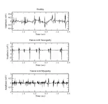 Studies have been done with electromyography to trace skeletal muscle activity in some hyperkinetic disorders. The electromyogram (EMG) of dystonia sometimes shows rapid rhythmic bursts, but these patterns can almost always be produced intentionally. In the myoclonus EMG, there are typically brief, and sometimes rhythmic, bursts or pauses in the recording pattern. When the bursts last for 50 milliseconds or less they are indicative of cortical myoclonus, but when they last up to 200 milliseconds, they are indicative of spinal or brainstem myoclonus. Such bursts can occur in multiple muscles simultaneously quite quickly, but high time resolution must be used in the EMG trace to clearly record them. The bursts recorded for tremor tend to be longer in duration than those of myoclonus, although some types can last for durations within the range for those of myoclonus. Future studies would have to examine the EMGs for tics, athetosis, stereotypies and chorea as there are minimal recordings done for those movements. However, it may be predicted that the EMG for chorea would include bursts varying in duration, timing, and amplitude, while that for tics and stereotypies would take on patterns of voluntary movements.[4]
