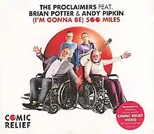 In 2007, the Proclaimers re-recorded the song with Peter Kay and Matt Lucas as their characters Brian Potter from Phoenix Nights and Andy Pipkin from Little Britain respectively. There is a slight change in the title of the song, with the parentheses placed around "(I'm Gonna Be)" rather than "(500 Miles)". The lyrics also include a change, with the words "roll 500 miles" replacing "walk 500 miles", because the characters Brian Potter and Andy Pipkin are both in wheelchairs. "(I'm Gonna Be) 500 Miles" was released as a charity single for Comic Relief immediately following its performance on the Comic Relief 2007: The Big One television show on BBC1 on 16 March 2007.[34] It reached number 3 on the official UK Singles Chart on download sales alone, and one week later reached number 1, where it remained for three weeks. It sold 126,000 copies in its first week, making it the biggest-selling number one of the year up to that point.[35] Its sales were double that of the official Comic Relief single by Girls Aloud vs. Sugababes, and their cover of Aerosmith's "Walk This Way". The song ended 2007 as the year's 8th biggest-selling single in the UK.[36] The song was popular in Ireland as well and peaked at #7 in Irish Singles Chart.