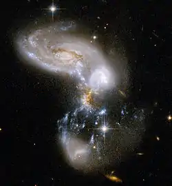 The shape of the merging galaxies is unusual; a number of powerful young starburst regions[3] hang as long, threadlike structures between the main galaxy cores. The system is relatively luminous, but has not yet reached the late stage of coalescence that is the norm for most ultraluminous systems.[1]