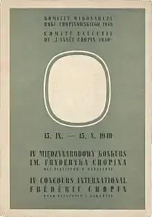 The IV International Chopin Piano Competition (Polish: IV Międzynarodowy Konkurs Pianistyczny im. Fryderyka Chopina) was held from 15 September to 15 October 1949 in Warsaw. The first competition after World War II, it was held in connection with the centenary of Chopin's death. Polish pianist Halina Czerny-Stefańska and Soviet pianist Bella Davidovich shared first place. Due to the wartime destruction of the National Philharmonic, the auditions were held at the Roma Theatre on Nowogrodzka Street.