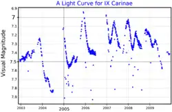 IX Carinae is a semiregular variable star, but its properties are poorly-defined. Different sources give its brightness range as magnitude 7.2 to 8.5.[3] or 6.87 to 7.9.[4] The International Variable Star Index finds a period of approximately 384 days from ASAS-3 and visual observations, but also gives a possible period of 108 days.[4] Another analysis finds a primary period of 408±50 d and a longer secondary period of 4,400±2,000 d.[8][3]