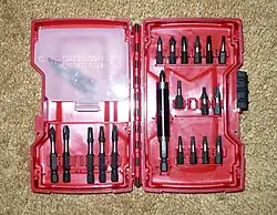 Typical battery-powered impact drivers are similar to electric drills when used to drive screws or bolts, but additionally have a spring-driven mechanism that applies rotational striking blows once the torque required becomes too great for the motor alone. This shouldn't be confused with the hammer mechanism found on hammer drills, which is a longitudinal blow.[3] Most impact drivers have a handle to make it easier to hold onto. The impact drivers can be used on various types of nuts and bolts, and surfaces. Various materials may be used with it, including steel, iron, wood, plastic, and more. An impact driver is more appropriate than a drill for tightening bolts.