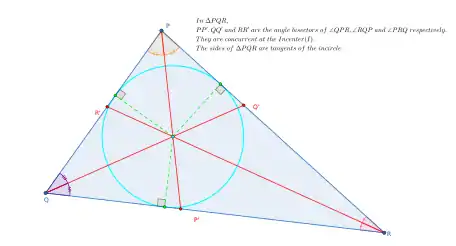 It is a theorem in Euclidean geometry that the three interior angle bisectors of a triangle meet in a single point. In Euclid's Elements, Proposition 4 of Book IV proves that this point is also the center of the inscribed circle of the triangle. The incircle itself may be constructed by dropping a perpendicular from the incenter to one of the sides of the triangle and drawing a circle with that segment as its radius.[3]