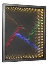 In a classic self-contained infinity mirror, a set of light bulbs, LEDs, or other point-source lights are placed around the periphery of a fully reflective mirror, and a second, partially reflective "one-way mirror" is placed a short distance in front of it, in a parallel alignment. When an outside observer looks into the surface of the partially reflective mirror, the lights appear to recede into infinity, creating the appearance of a tunnel of great depth that is lined with lights.[2]