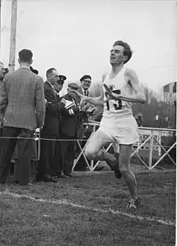 ![]() Frank Sando crossing the line to win the 1957 edition of the championships | |