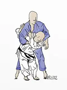The ippon seoi nage (一本背負い投げ, lit. 'one arm over the back throw') is a throw in judo.[1] It is a variant of Seoi nage, and is one of the nineteen accepted techniques in Shinmeisho No Waza of Kodokan Judo. It is classified as a hand throwing technique, or te-waza.[2] Ippon seoi nage literally means "one arm over the back throw", but has also been translated as a "one arm shoulder throw", as the opponent or uke is thrown over the thrower or tori's shoulder.[3]