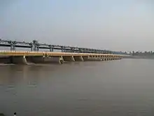 The barrage is about 15 kilometres (9.3 mi) north of Hasilpur and about 7.5 kilometres (4.7 mi) south of Luddan on the Vehari-Hasilpur road. It was completed in 1927 as the Sutlej Valley Project[1] for irrigation of Nili Bar. At 503 metres (1,650 ft) long with a design discharge of 8,500 cubic metres per second (300,000 cu ft/s), it has two off taking larger canals which irrigate 278,800 hectares (689,000 acres) of land in Southern Punjab and 283,300 hectares (700,000 acres) in the former Bahawalpur state. Mailsi Canal (150 m3/s) arises from its right bank and Bahawal Canal (150 m3/s) from the left; a third, smaller canal called Qaim Canal (15.8 m3/s) also arises from the left bank.