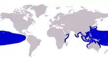 The island trevally is distributed throughout the offshore waters of the tropical and subtropical regions of the Indian and Pacific Oceans. In the Indian Ocean, it ranges from Mozambique on the east coast of Africa north to the Gulf of Aden, but has not been recorded further north until India and Sri Lanka.[6] Its range extends throughout Southeast Asia, Indonesia, and northern Australia in the eastern Indian Ocean. In the Pacific, the species has been recorded from Taiwan, Japan, and Hawaii to the Revillagigedo Islands off Mexico in the eastern Pacific, as well as many Pacific islands.[6]
